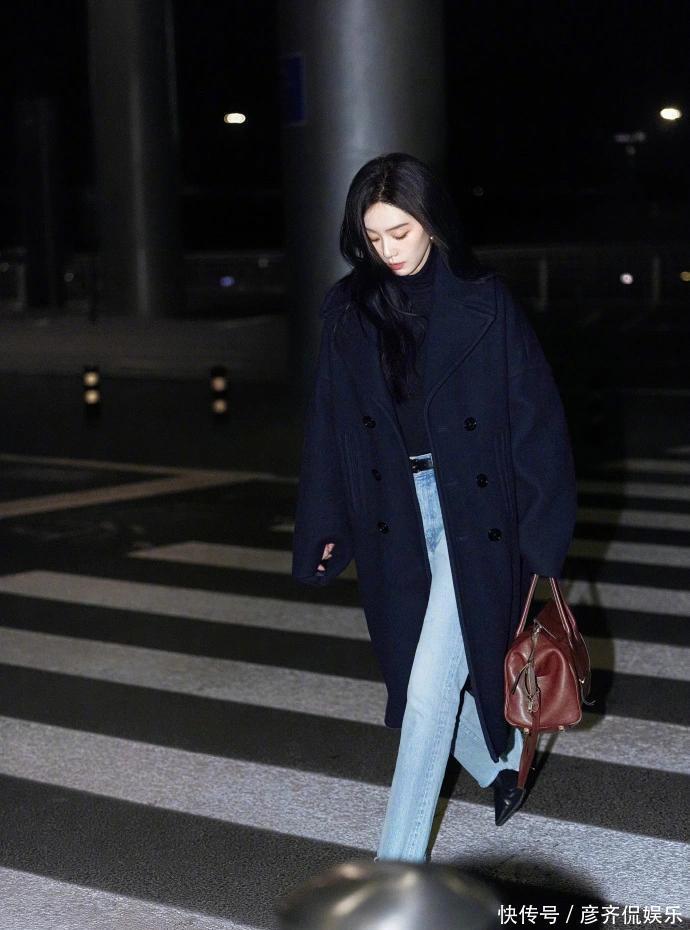 当然如果你不喜欢毛领大衣,纯色系的大衣也是不错的选择!刘诗诗下面这款蓝色廓形大衣,内搭黑色高领衫,下半身搭配蓝色牛仔裤,也是时髦又亮眼,走在街头,韩剧女主既视感!