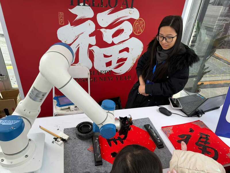 中国青年报客户端讯(中青报·中青网记者 孟佩佩)一只机械臂在红纸上写下“福”字;机器狗组成的舞狮队腾跃翻滚;咖啡机、煎饼果子机在AI的驱动下为往来宾客奉上一份份美味……2月28日下午,年味儿还未散尽,“你好,AI!”海淀北部片区人工智能创新生态发展论坛的现场,科技感十足的烟火气不断吸引着人们驻足。