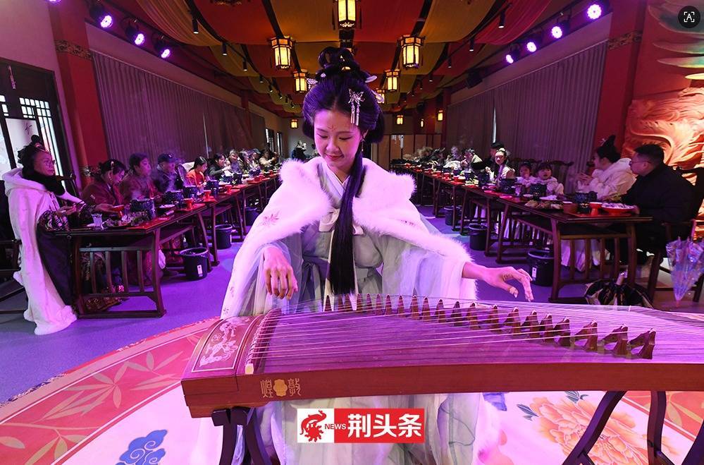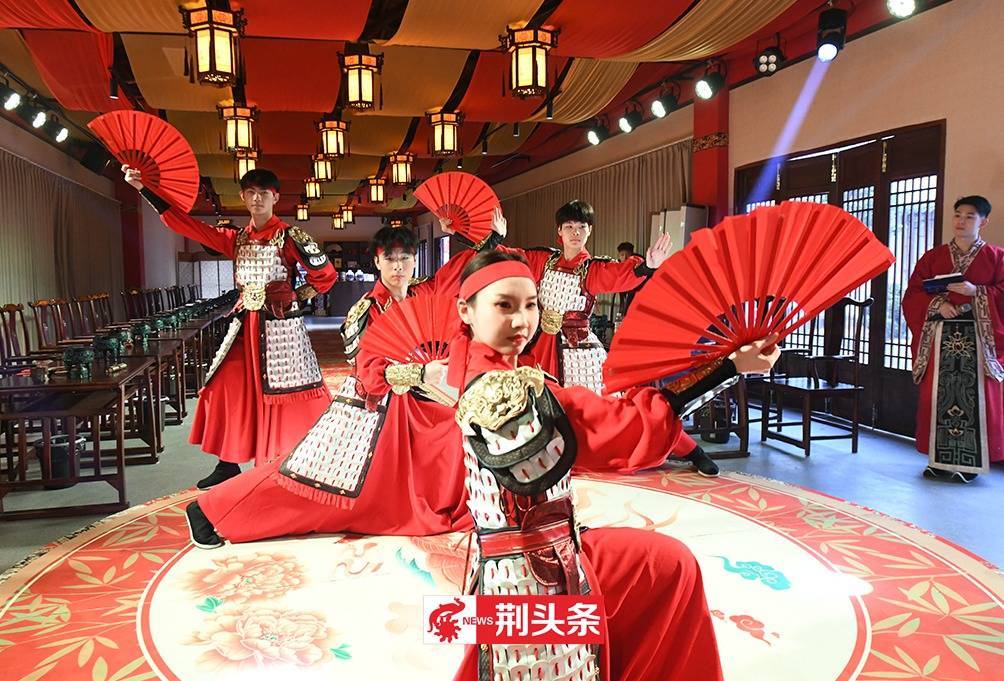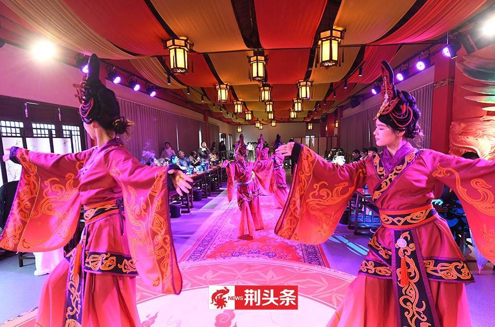 元宵佳节,荆州古城北门片区文旅热度持续攀升,傍晚六点,三义街率先点燃节日热情。备受好评的沉浸式餐秀《三国宴》火热开宴,古色古香的建筑在灯笼映照下更显韵味。食客们围坐于仿古案几前,除了能够品尝洪湖藕汤、荆襄烤乳猪、荆楚非遗米糕等地道风味,还能与演员沉浸式互动,感受三国文化的独特魅力。